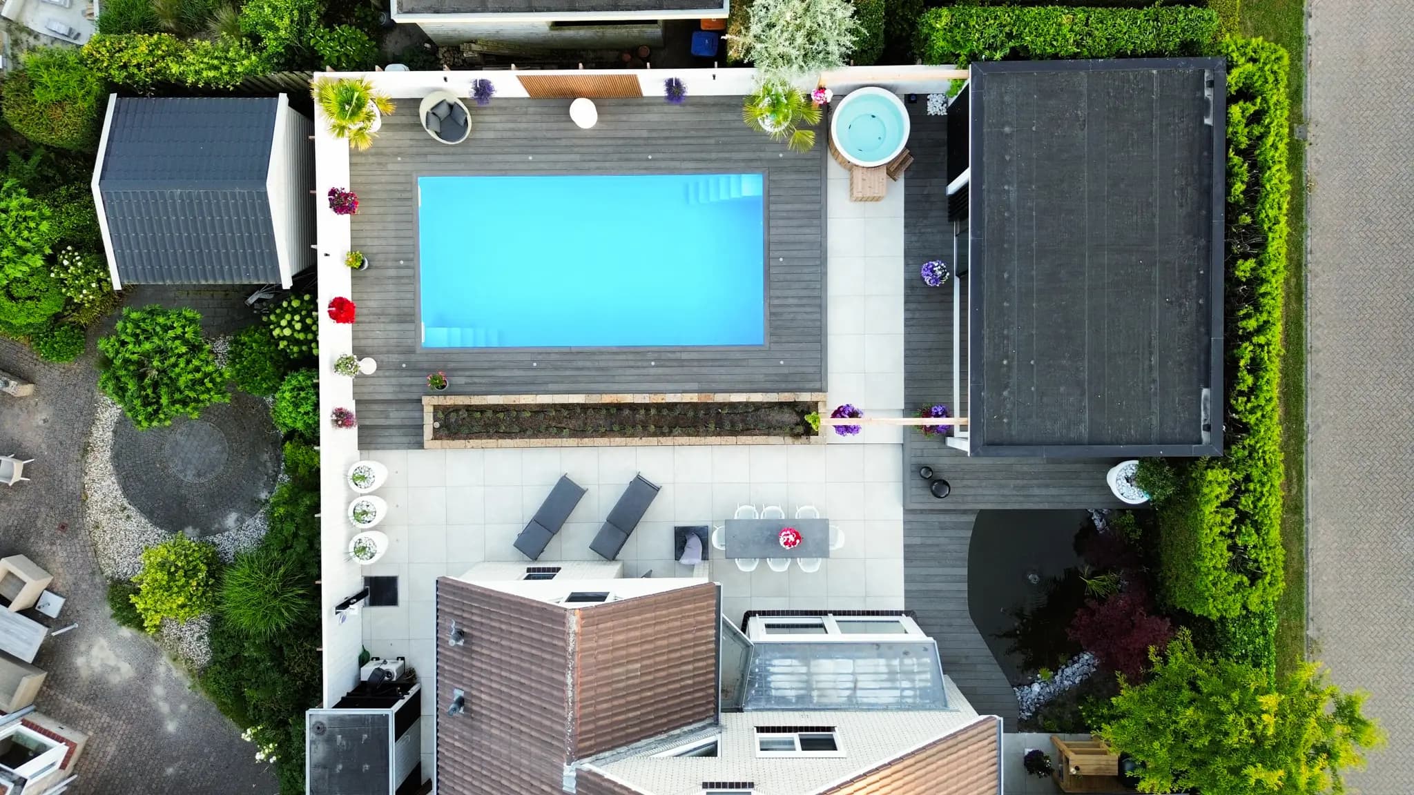 Voor het terras is gekozen voor een duurzame Geoceramica tegel, een onderhoudsvrije en milieuvriendelijke keuze die perfect past binnen de moderne, strakke lijnen van het ontwerp. Daarnaast als zwembad afwerking is gekozen voor Millboard vlonderplanken. Deze geven en strakke en warme sfeer aan het geheel. Subtiele, in het ontwerp verwerkte tuinverlichting zorgt ’s avonds voor een warm en uitnodigend geheel, zonder in te leveren op functionaliteit of sfeer.