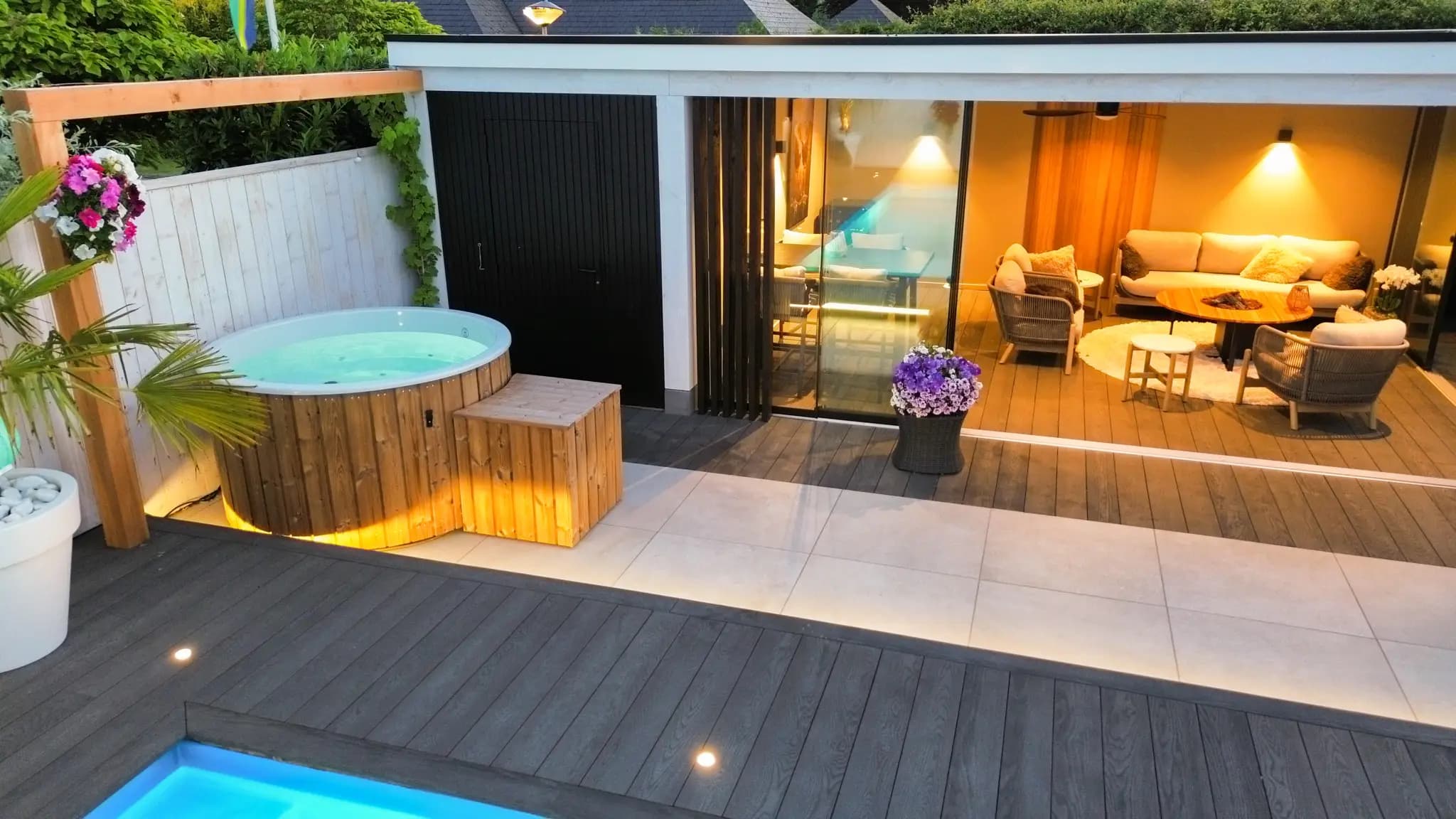 Voor deze stijlvolle achtertuin ontwierpen en realiseerden wij zowel de complete tuin als een op maat gemaakte tuinkamer. Het resultaat hiervan is een sfeervolle, moderne buitenruimte waarin ontspanning centraal staat. En dat helemaal met de toevoeging van de hottub. Zo komen comfort en luxe samen in deze moderne buitenruimte.